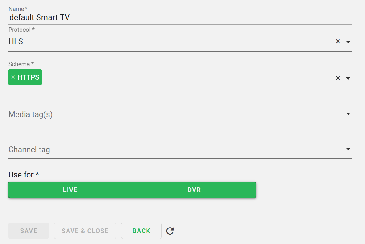 For Smart TV Tizen and WebOS - Live and Dvr, HLS stream, HTTP and HTTPS scheme;