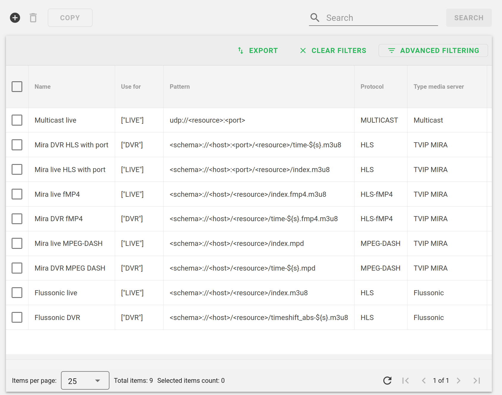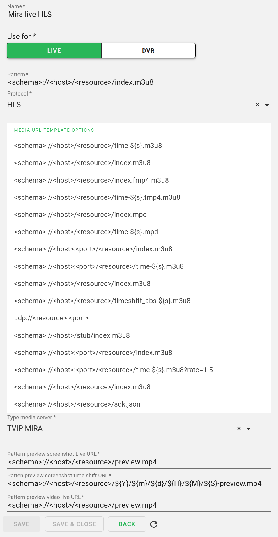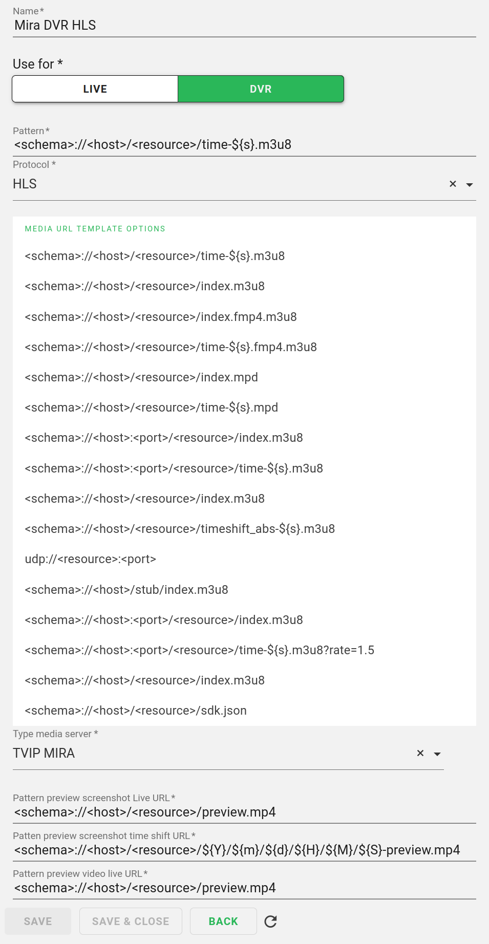 Let’s make sure there are suitable Dvr and Live templates for our TVIP MIRA server type: