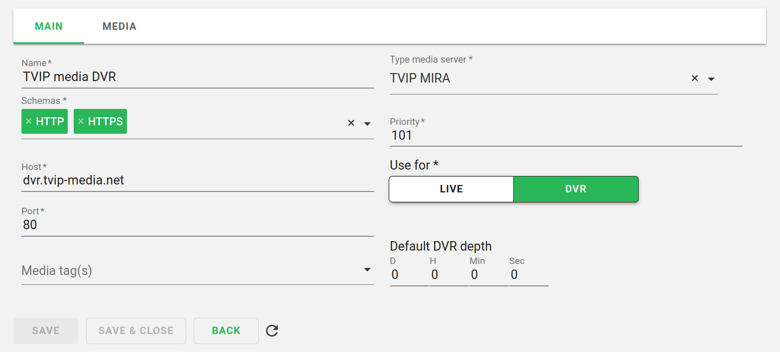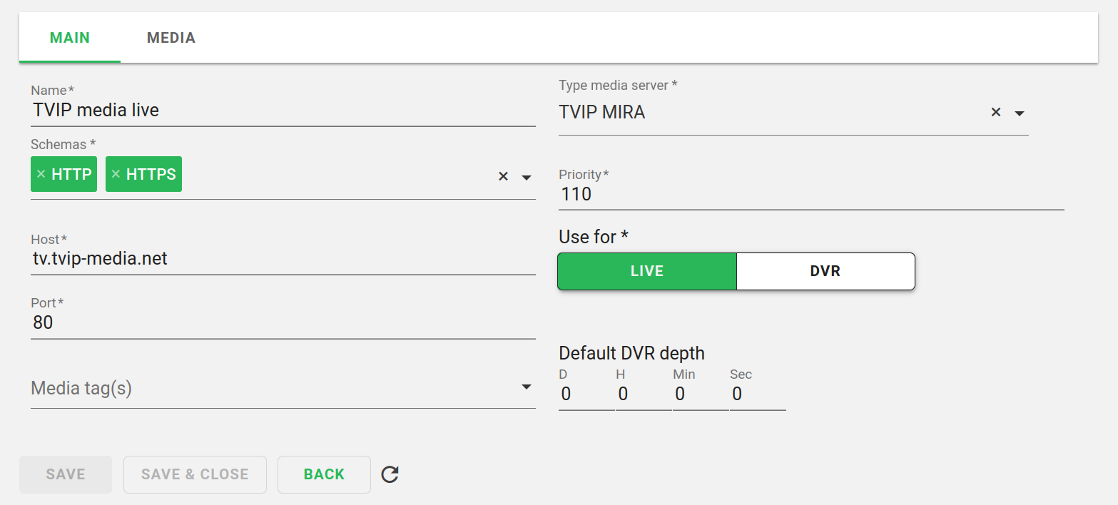 Media server - description of the server, which has a specific type, supported schemes (http/https), the address of connection to the server, its priority and the list of channels available on this server (in the Media tab), which this server contains.
