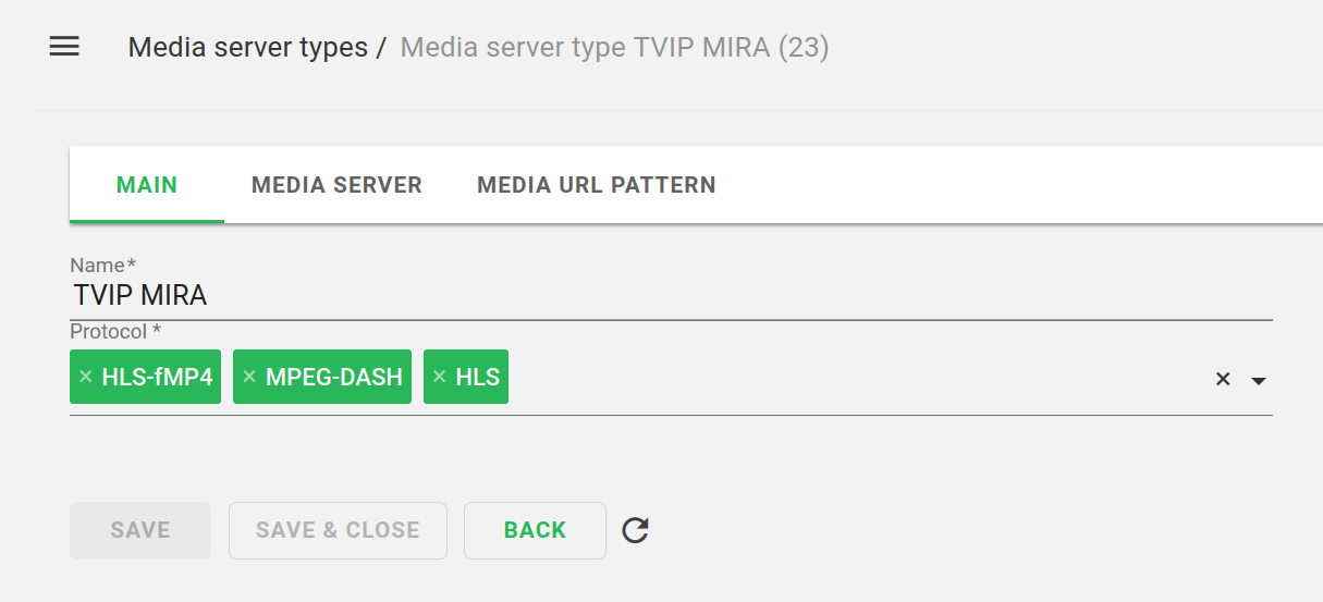 Media server type determines which streaming protocols are supported by the server and what pattern is used to generate the final URLs of the streams that it broadcasts. Since these parameters are largely determined by the software used for streaming, it is convenient to use the names of specific implementations or vendors to identify media server types. For example, TVIP Mira and Flussonic are considered types of media servers.