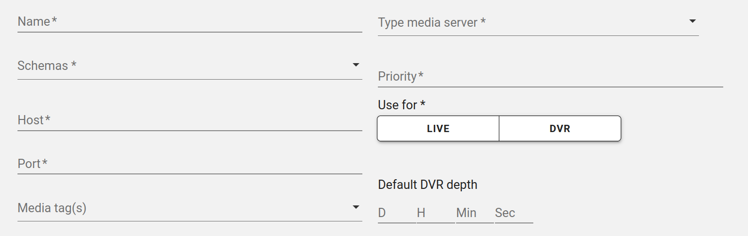 A drop-down list for selecting a media server. When filled in from the media server creation interface, this field is blocked for editing - in this case it is bound to the server being created by default.