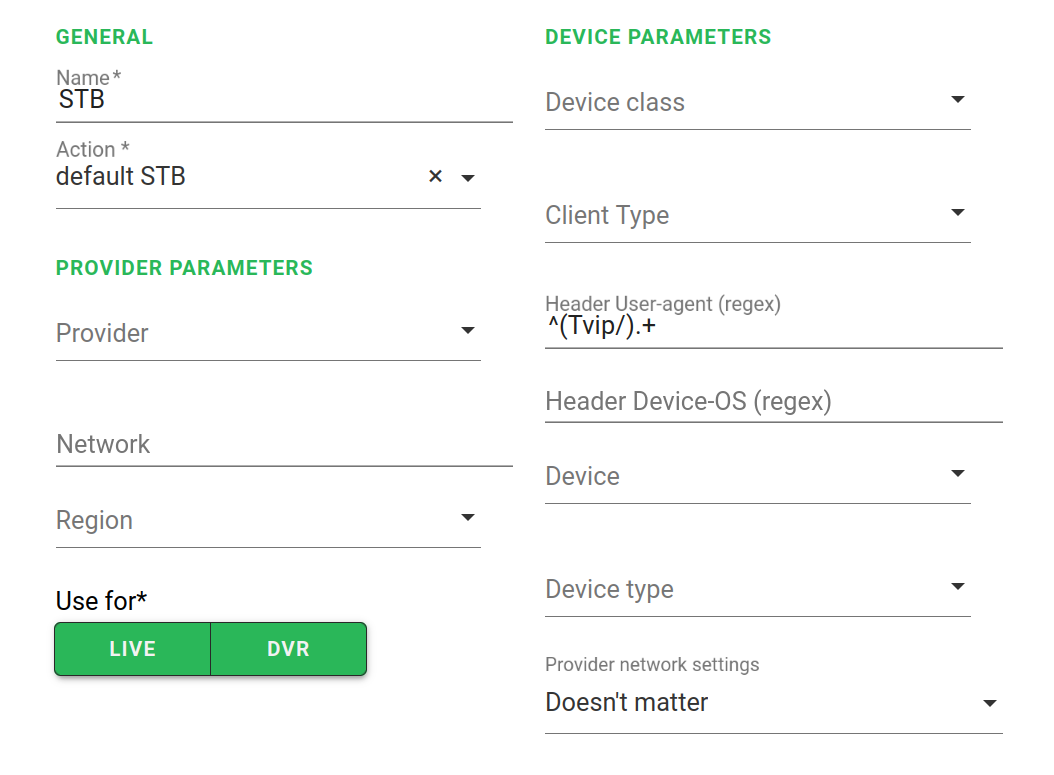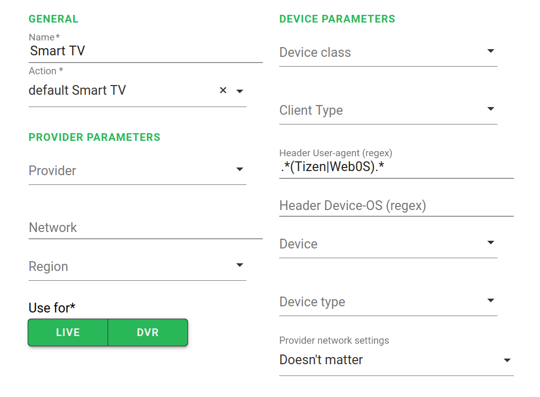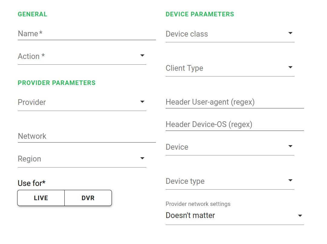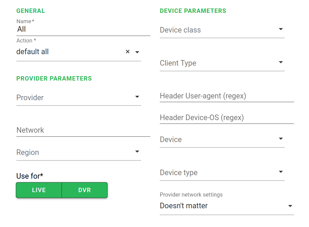 Live - apply the rule when requesting links to live broadcasts, DVR - apply it when requesting access to DVR archive. Both options can be selected simultaneously.