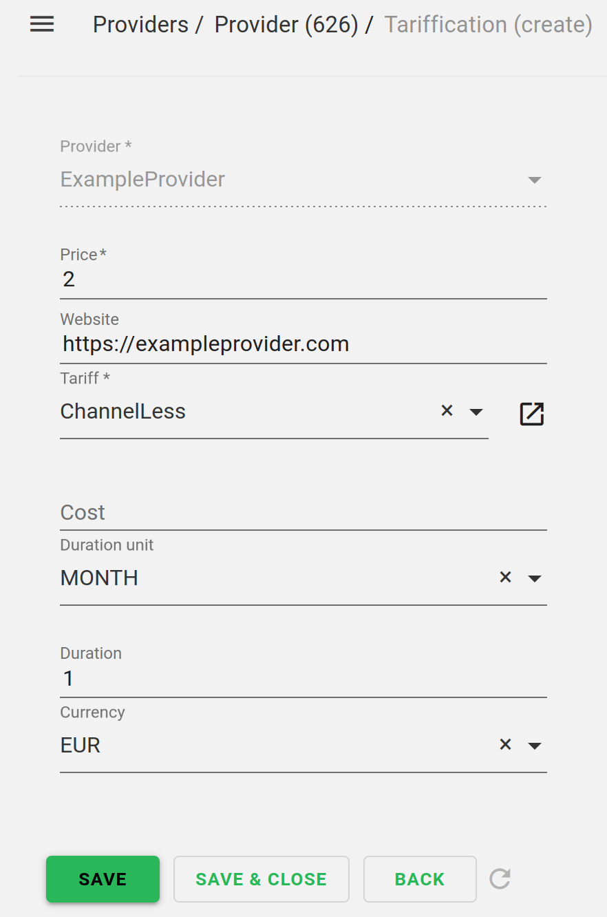 On the page of the selected provider go to the Tariffication tab and click the + button above the table. After that the page of tariffication settings will be displayed, where you will need to fill in the following fields: