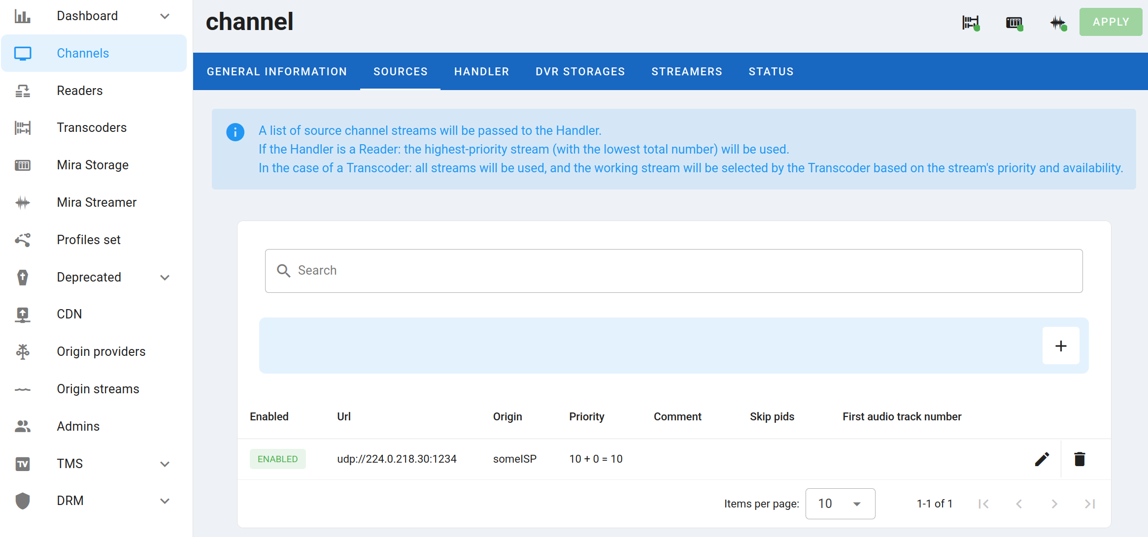 В случае, если редактируется или добавляется новый источник для ранее созданного канала, то для применения настроек на транскодере сначала нажмите кнопку APPLY в верхнем правом углу,