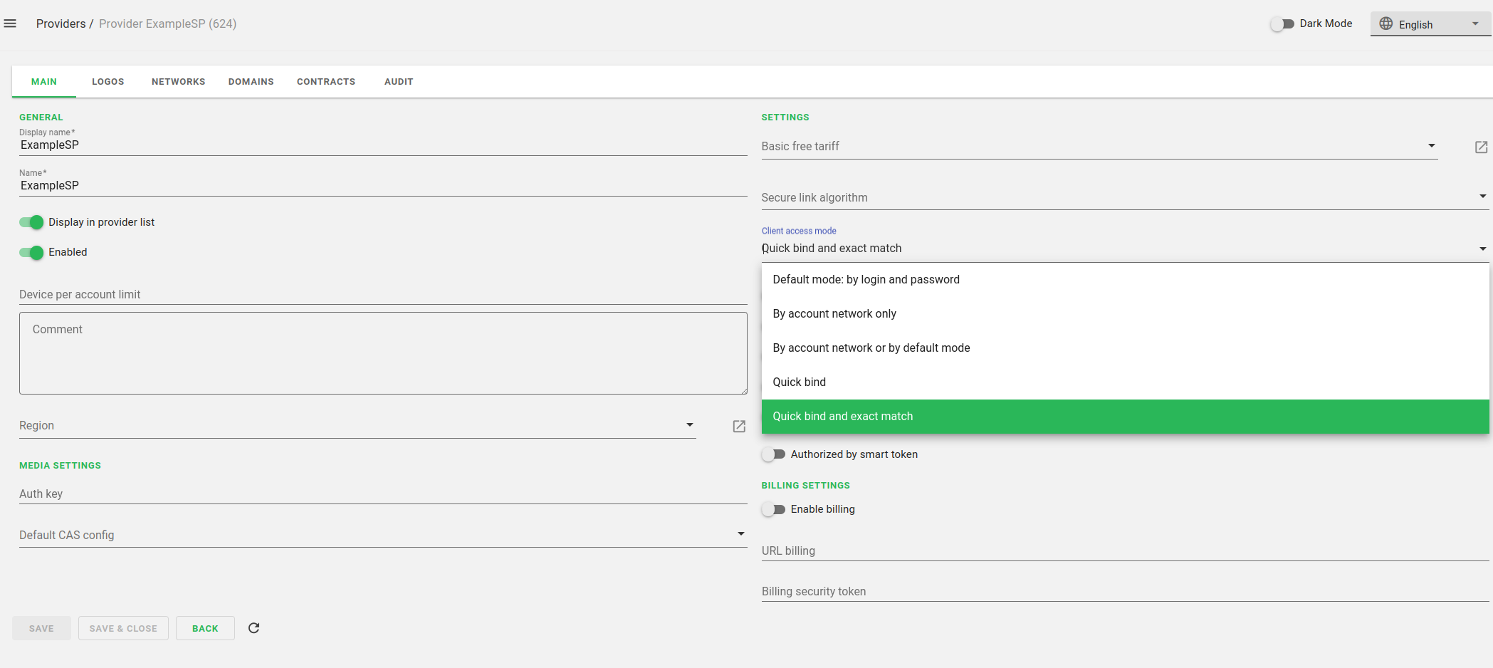 В настройках Провайдера в разделе Режим доступа клиента из выпадающего списка выбрать Быстрая привязка или Быстрая привязка при строгой безопасности;